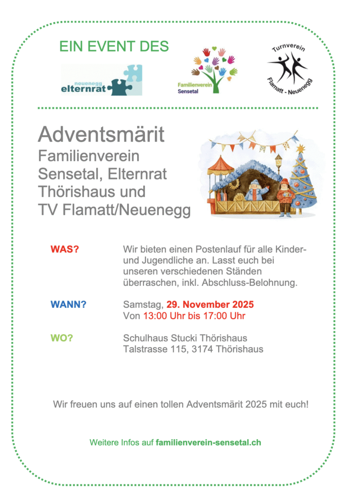 Wer ist bei unserem Postenlauf mit dabei? Am 29. November 2025 von 13 bis 17 Uhr auf dem Adventsmärit beim Schulhaus Stucki – wir freuen uns auf euch!