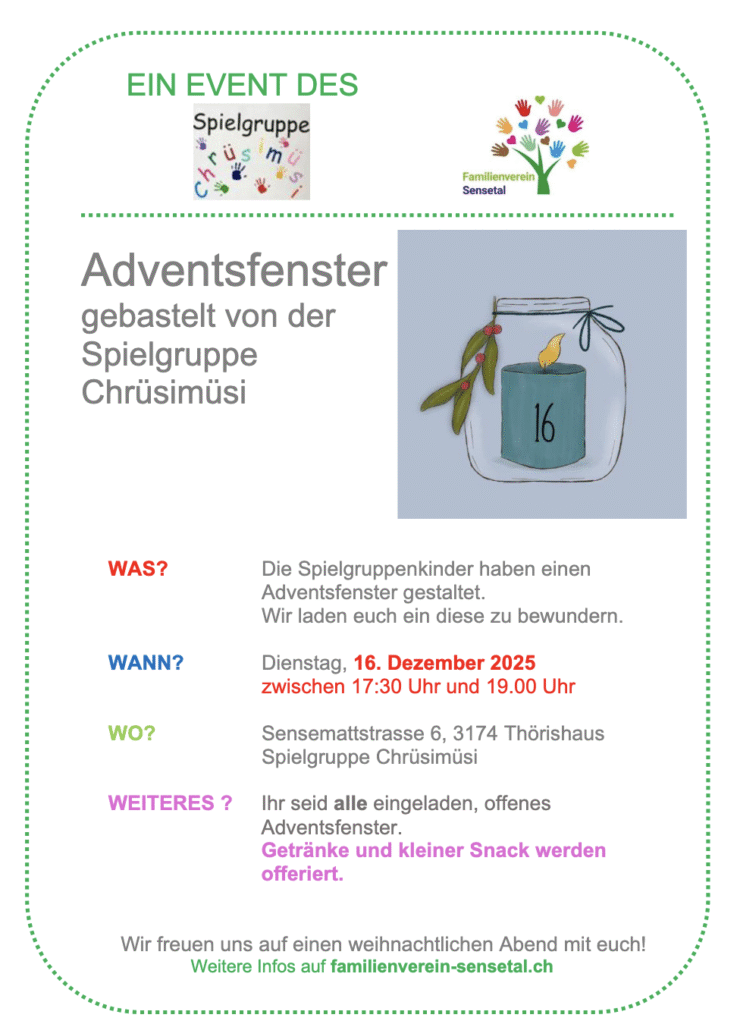 Am Dienstag 16. Dezember könnt ihr bei uns in der Spielgruppe das von der Spiergruppenkindern gestaltete Adventsfenster bewundern. Kommt zwischen 17:30 und 19:00 Uhr in der Spielgruppe Chrüsimüsi vorbei, trinkt mit uns was und lässt euch mit Weihnachtsstimmung anstecken.