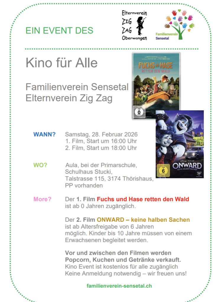 Film ab – am Samstag 28. Februar zeigen zwei tolle Filme: ab 16 Uhr für die kleineren und ab 18 Uhr für die grösseren Kinder. Weitere Infos hier: